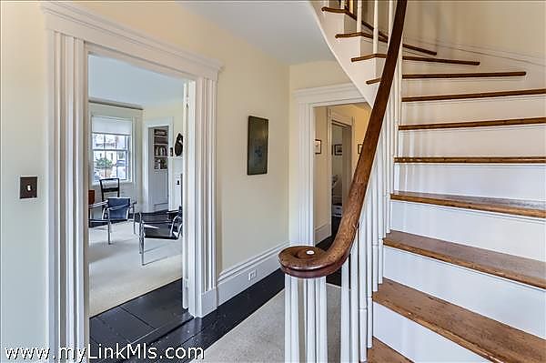 Two of the five bedrooms are on the first floor, including a private ensuite with a full bath. The home is notable for its unusually large and abundant windows, flooding the south-facing interior with natural light. The winding staircase is a sculptural centerpiece that greets you as you enter through the original front door. Renovations include a new roof over the porch, three modernized bathrooms, and updates throughout the first and second floors, all carefully designed to honor the home’s historic charm.