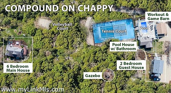 WELCOME to this turn-key CHAPPY COMPOUND! This property offers it ALL, with its Six (6) Bedroom, Five (5) bath Primary Home, Two (2) bedroom, Two (2) bath GUEST HOUSE, expansive POOL HOUSE with a bath, kitchenette, large lounge area topped with a cathedral ceiling, a WORKOUT & GAME BARN, a POOL, a VOLLEY BALL COURT and a TENNIS and PICKLEBALL COURT that has recently been resurfaced with the traditional US Open colors. The court is lined for tennis as well as two full pickleball courts with portable nets. Game on! All of this is set upon three acres of private, expansive land with distant WATER VIEWS!