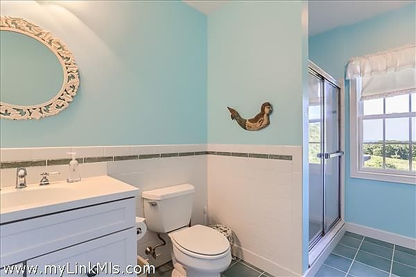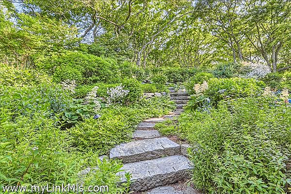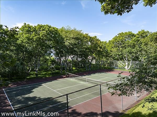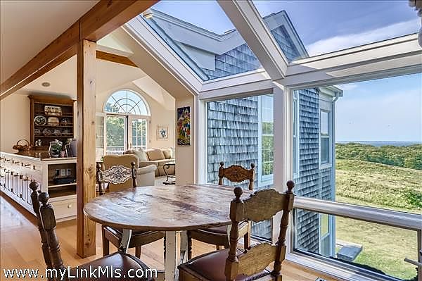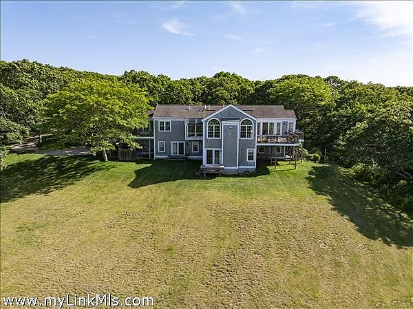 Perched high on the north shore with sweeping views of the Vineyard Sound, this expansive and private property is surrounded by Menemsha Hills conservation land and trails and offers broad water views, even from ground floor of house. The house is large and well maintained with an upside down floor plan allowing for high ceilings and bright spaces in the open plan kitchen/dining/living room, as well as the primary bedroom suite and office on this upper level. This is a great house for entertaining and offers A/C, screened porch, generator, music system, outdoor lighting and other perks. The exterior space features a tennis court, beautiful gardens with water feature, and a cleared meadow, which is several acres in size, surrounded by woodlands. No other houses can be seen from here. A pool is possible and there is plenty of space for this addition. Subdivision potential. Includes Brickyard Beach rights.