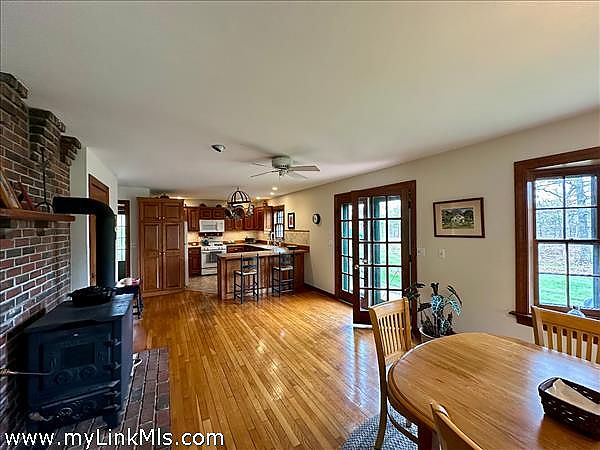 This Cape Style home privately sited on 1.89 acres at the end of a cul-de-sac abutting conservation land with many walking trails. Nice features include spacious living spaces that include a well equipped kitchen with custom cherry cabinets, dining room, living room with fireplace, wood stove and french doors that lead you out to a private patio and backyard. Second floor offers two guest bedrooms, primary bedroom and full bath. There are wood floors throughout, a butler's pantry off the kitchen, full basement with a dormered bulkhead. The owner, a cabinetmaker and finish carpenter currently has it set up as a workshop. The nicely landscaped yard with mature plantings and gardens offers a peaceful setting. There is also a garden shed for garden and outdoor equipment.