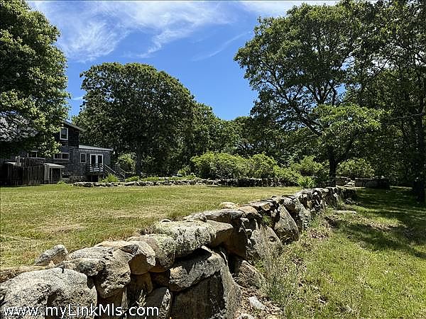 There is a driveway to the property directly off Moshup Trail and an expansive backyard meadow perfect for a larger new house, a pool, or a large play area. Additionally, the property includes a charming 2-bedroom, 1.5-bathroom cottage with hardwood floors, providing an immediate, cozy living space.