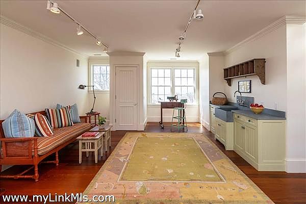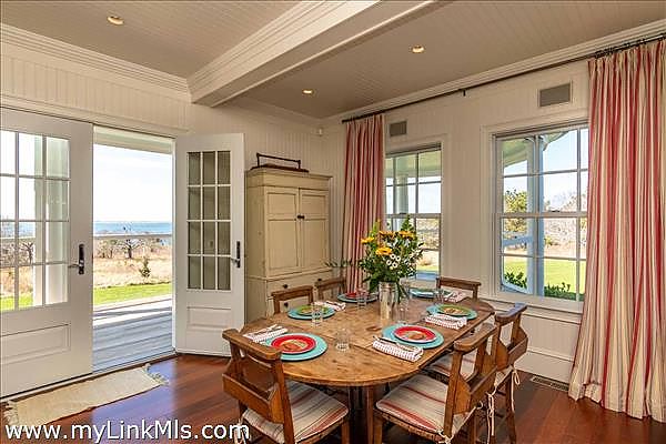 The combined screened and covered porch, which extends nearly the full length of the home and overlooks Katama Bay, is a defining feature of the property, providing ample space for al fresco summer meals, reading, playing games, or simply soaking in the brilliant evening sunsets.