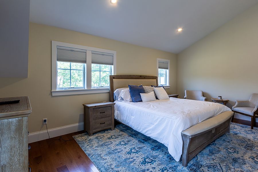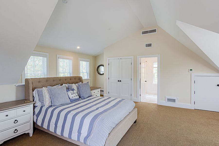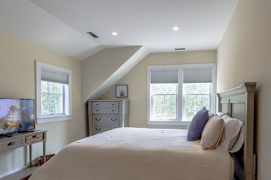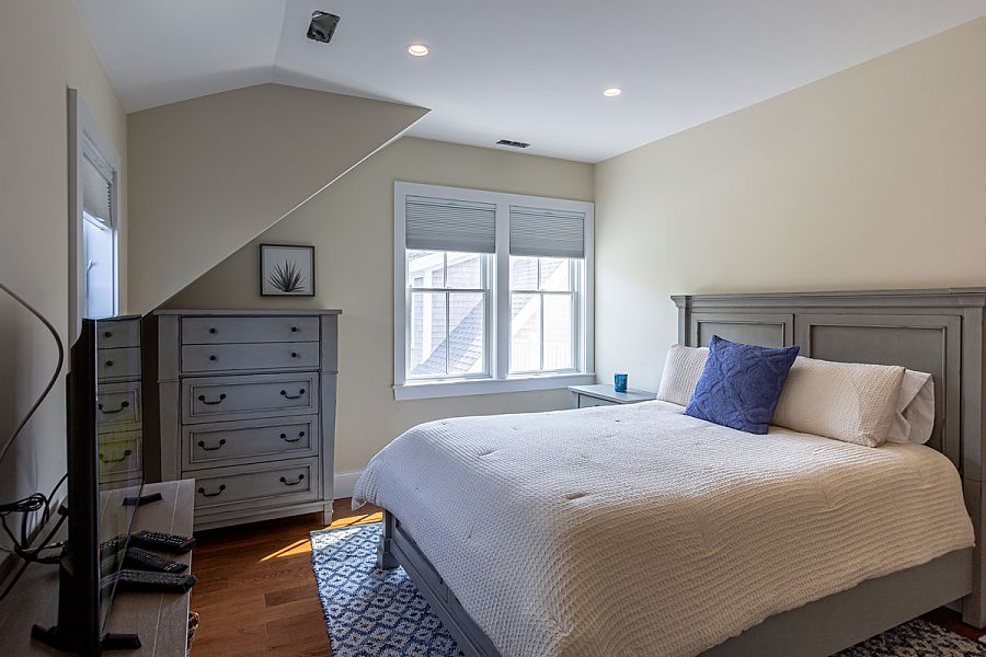The first of three bedroom suites is located on the main level and includes a King Bed, ensuite bath, and TV. Suite #2, situated on the second level, boasts a King Bed, ensuite bath, and access to a private deck. Two additional guest bedrooms, one with two single beds and the other with a Queen Bed, share a spacious hall bath on this level. The third suite, located above the carriage house, features a Queen Bed, ensuite bath, and TV, and opens onto a private roof deck. Accessible from within the house, this bedroom offers added privacy and comfort.