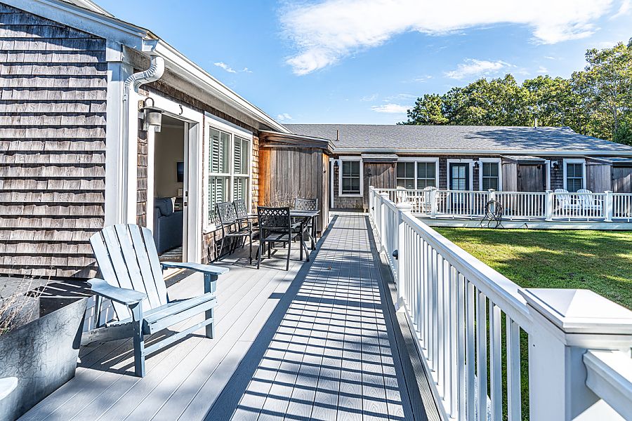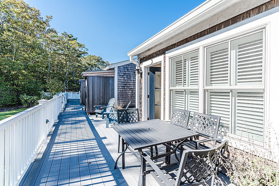 Enjoy the shared outdoor space, featuring a charming back deck, nicely separated by storage sheds for added privacy. This lovely unit includes a dining table for four and two Adirondack chairs, overlooking a manicured lawn and serene woodlands beyond.