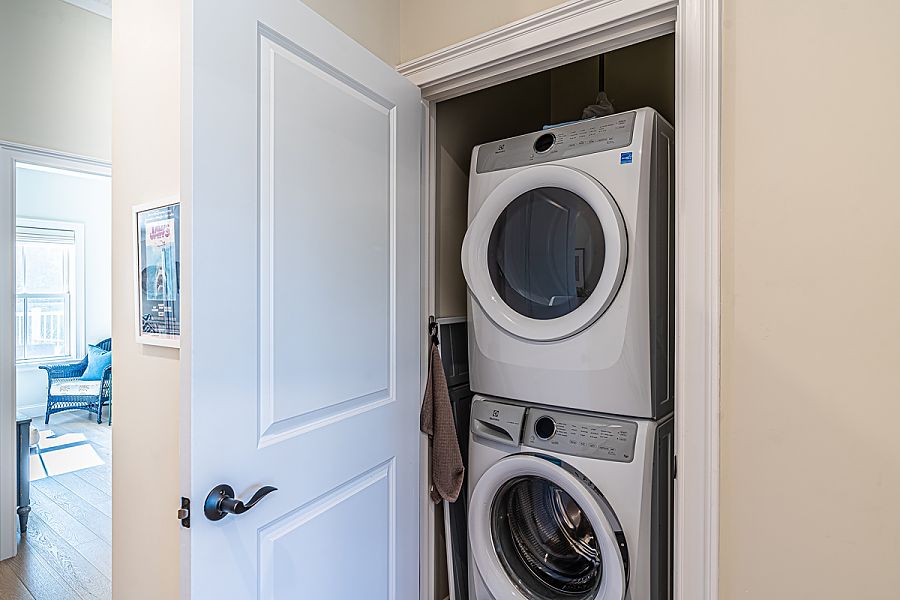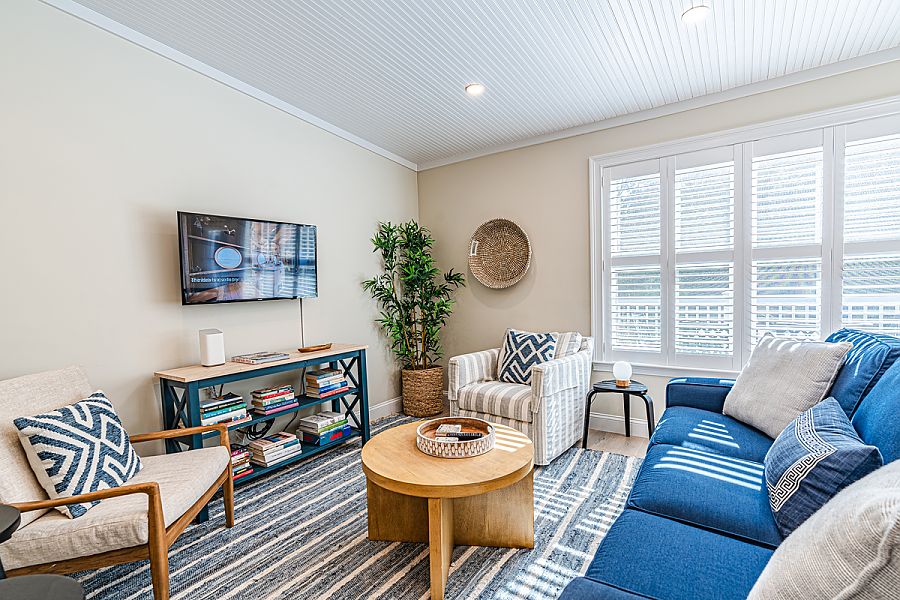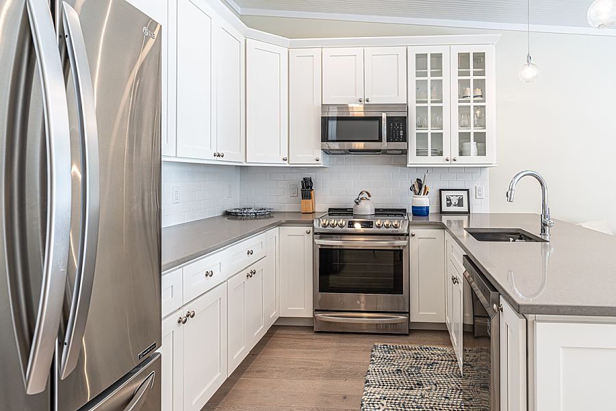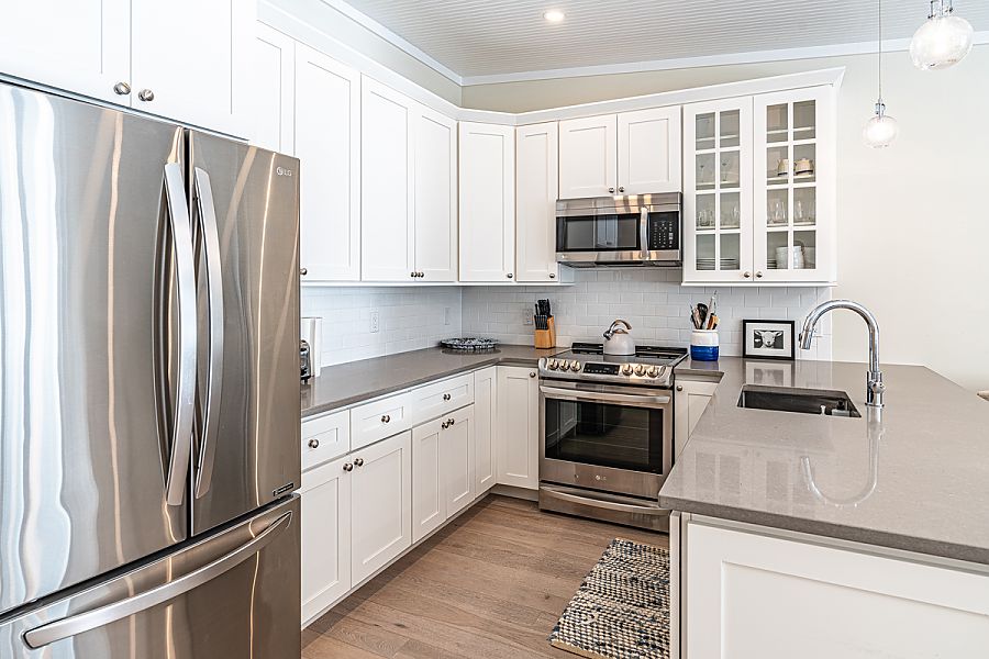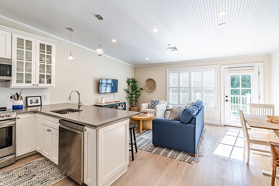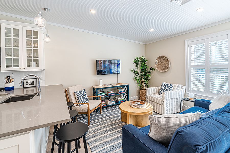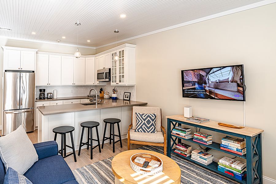 Inside, you'll find a spacious layout with two bedrooms and two bathrooms. The sun-filled main living area seamlessly connects to the kitchen, creating an inviting space for relaxation and entertainment. The living room features comfortable seating around the media area and opens onto the back deck. The modern kitchen is equipped with stainless steel appliances, quartz countertops, a prep island, and a breakfast bar that seats 3. A small hallway discreetly separates the living space from the bedrooms. The primary bedroom boasts a king bed and a private bathroom with a walk-in shower. The second bedroom offers a queen bed and the bath is located just across the hall.