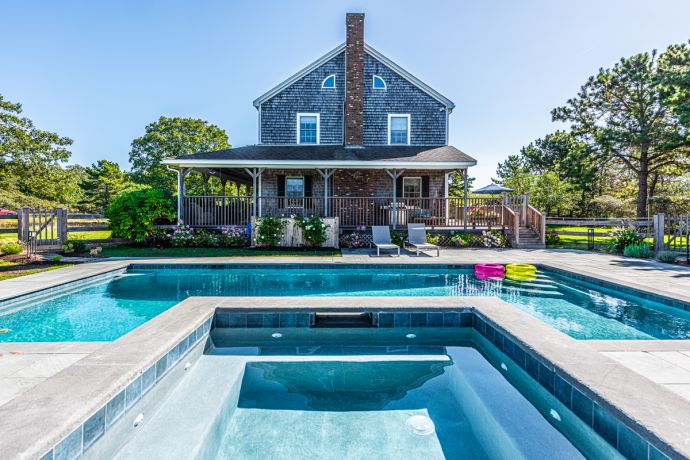 Lovely farmhouse-style 5-bedroom home with heated pool, main house, and guest apartment over the garage centrally located and easily accessible to Long Point Beach and Edgartown Center. The Main House features an open...Read more